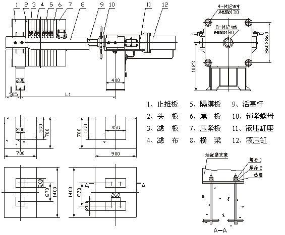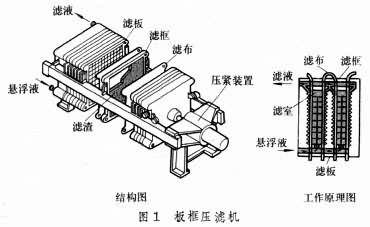 板框壓濾機的濾室結(jié)構(gòu)由成組排列的濾板和濾框組成。板框壓濾機的濾板在表面設(shè)計有凹槽,用以安裝、支撐濾布,并引導過濾液的流向,而濾框和濾板在組裝后構(gòu)成液體流通通道,用以通入懸浮液、洗滌水和引出濾液。 板框壓濾機的濾板和濾框都由壓緊裝置壓緊,同時在濾板和濾框的部位設(shè)有把手,用于支撐整個濾室結(jié)構(gòu)。板框壓濾機的濾板和濾框之間所安裝的濾布,除了承擔過濾的工作之外,還能起到密封墊片的作用。