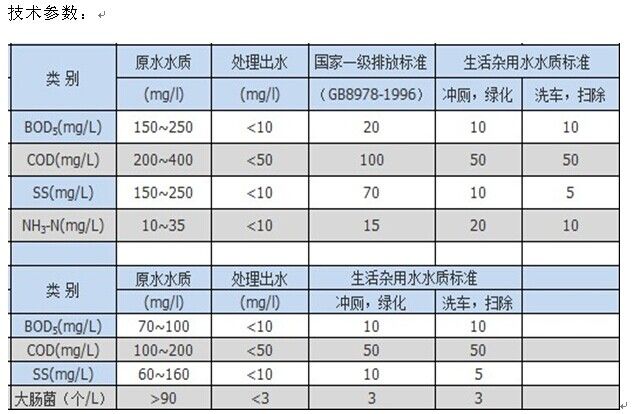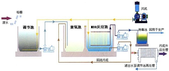 污水經格柵除去飄浮和大顆粒懸浮雜質后進入調節(jié)池,(調節(jié)池不在一體化中),調節(jié)池中污水由提升泵提升進入MBR處理設備中。對于生活污水、餐用污水,污染物濃度較高,可生化性較好,適宜采用好氧生物法進行處理。好氧工藝是一個主要耗能單元,在選擇時應考慮如何提高污泥負荷,降低投資費用和運行費用。根據(jù)上述原則,結合設備特點,參照國內外污水處理研究成果及已建成的廢水處理站的運行經驗,本方案選擇膜生物反應器作為主處理單元,膜生物反應器是二十世紀末發(fā)展起來的水處理高新技術,它將膜分離技術與生物處理有機結合起來,主要應用于污水處理領域。由于它既利用了膜分離的選擇透過性,又利用了生物處理有效性及性,出水水質可滿足要求。在我國作為“八五”重點科技攻關項目的膜生物反應器污水凈化裝置已進入產業(yè)化,多元公司在國內將該技術應用于污水處理系統(tǒng)中,并取得十分顯著的社會、環(huán)境和經濟效益。